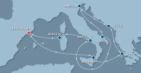 Barcelona - Palermo (Sicilia) - Corfú (Grecia) - Kotor (Montenegro) - Venecia (Italia) - Bari (Italia) - Nápoles (Italia) - Ajaccio (Córcega-Francia) - Barcelona