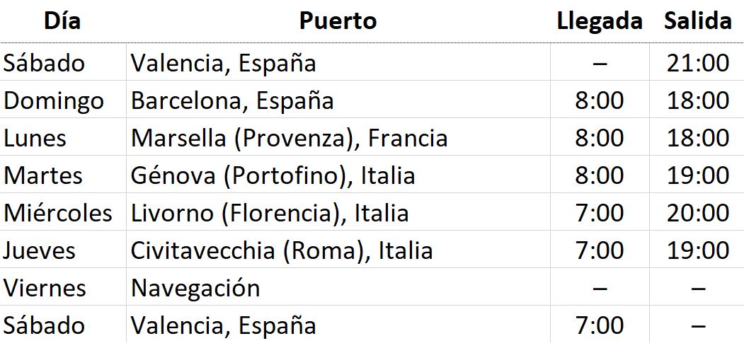 crucero de 8 días y 7 noches salida desde Valencia, visitando Barcelona (España), Marsella (Provenza Francesa) Genova (Portofino) Italia, Livorno (Florencia) Italia Civitavecchia (Roma) Italia y desembarcando de nuevo en el puerto de Valencia, a bordo del MSC ORCHESTRA y con un completo programa de animación diurno y espectáculos y fiestas cada noche en la Discoteca del barco.