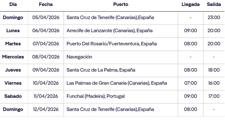 Salida desde Santa Cruz de Tenerife (España) y crucero con escalas en Las Palmas de Gran Canaria (España) Puerto del Rosario / Fuerteventura (España) Funchal Madeira (Portugal) Santa Cruz de la Palma (España) Lanzarote (España) y desembarcando de nuevo en Santa Cruz de Tenerife (España). Es un Crucero a bordo del MSC MUSICA, con un completo programa de animación diurno y espectáculos en el teatro y fiestas cada noche en la discoteca del barco.