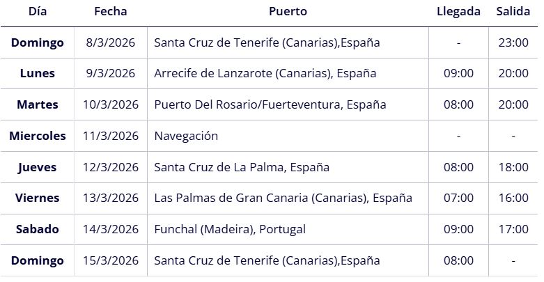 Salida desde Madrid (consultar vuelos desde otras ciudades) en vuelo directo para embarcar en Santa Cruz de Tenerife (España) y crucero con escalas en Las Palmas de Gran Canaria (España) Puerto del Rosario / Fuerteventura (España) Funchal Madeira (Portugal) Santa Cruz de la Palma (España) Lanzarote (España) y desembarcando de nuevo en Santa Cruz de Tenerife (España) para regresar desde allí en avión hasta Madrid o Barcelona. Es un Crucero a bordo del MSC MUSICA, con un completo programa de animación diurno y espectáculos en el teatro y fiestas cada noche en la discoteca del barco.
