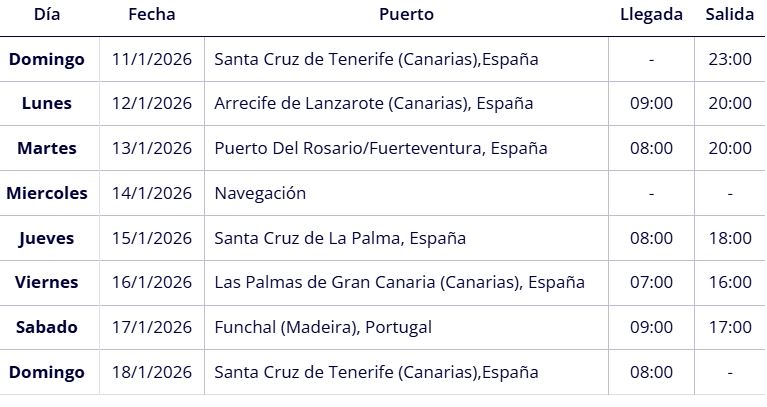 Salida desde Madrid (consultar vuelos desde otras ciudades) en vuelo directo para embarcar en Santa Cruz de Tenerife (España) y crucero con escalas en Las Palmas de Gran Canaria (España) Puerto del Rosario / Fuerteventura (España) Funchal Madeira (Portugal) Santa Cruz de la Palma (España) Lanzarote (España) y desembarcando de nuevo en Santa Cruz de Tenerifei (España) para regresar desde allí en avión hasta Madrid o Barcelona. Es un Crucero a bordo del MSC MUSICA, con un completo programa de animación diurno y espectáculos en el teatro y fiestas cada noche en la discoteca del barco.