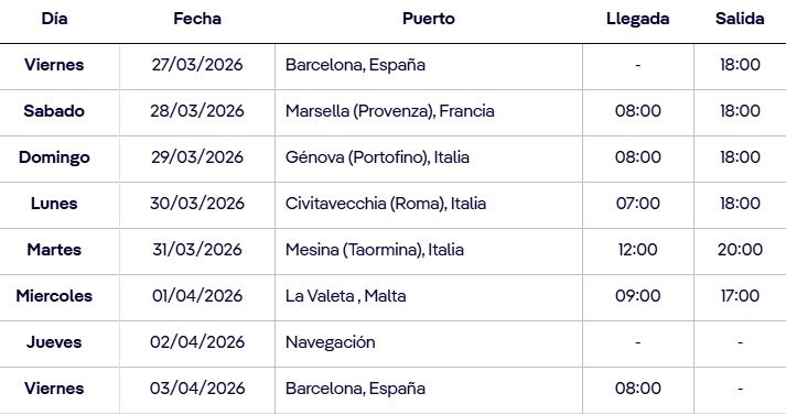 Salida el Viernes desde el puerto de Barcelona, visitando Marsella (Francia), Génova (Italia), Civitavecchia (Roma), Mesina (Taormina Sicilia), La Valeta (Malta) y desembarque en el puerto de Barcelona el viernes siguiente