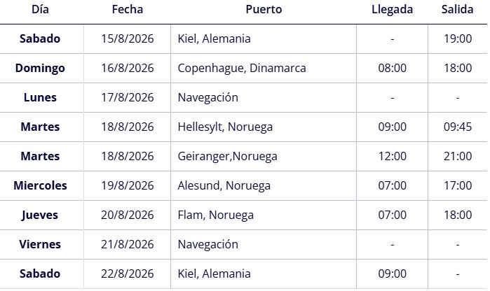 Kiel, Alemania · Copenhague, Dinamarca · Hellesylt, Noruega · Geiranger, Noruega · Alesund, Noruega · Flam, Noruega · Kiel, Alemania para volar de regreso a España.
