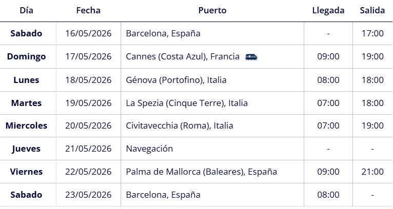 Crucero de 8 días, 7 Noches con salida desde el puerto de Barcelona, visitando Cannes (Costa Azul - Francia), La Spezia (Cinque Terre - Italia), Civitavechia (Roma - Italia), Pallma de Mallorca (Islas Baleares- España) y desembarque en el puerto de Barcelona con programa de animación y gran cantidad de opciones de ocio y entrenamiento diurno y nocturno con fiestas y sesiones de Discoteca cada noche.