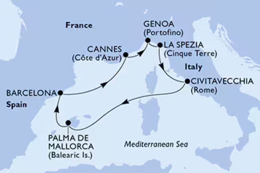 Crucero de 8 días, 7 Noches visitando Cannes (Costa Azul - Francia), La Spezia (Cinque Terre - Italia), Civitavechia (Roma - Italia), Pallma de Mallorca (Islas Baleares- España) y desembarque en el puerto de Barcelona.