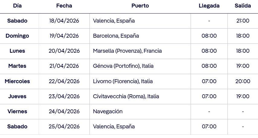 Os proponemos un estupendo crucero de 8 días y 7 noches salida desde Valencia, visitando Barcelona (Cataluña - España) Marsella (Provenza Francia) Genova (Portofino - Italia), Livorno (Florencia - Italia), , Civitavecchia (Roma) y desembarcando de nuevo en el puerto de Valencia, a bordo del MSC ORCHESTRA y con un completo programa de animación diurno y espectáculos y fiestas cada noche.