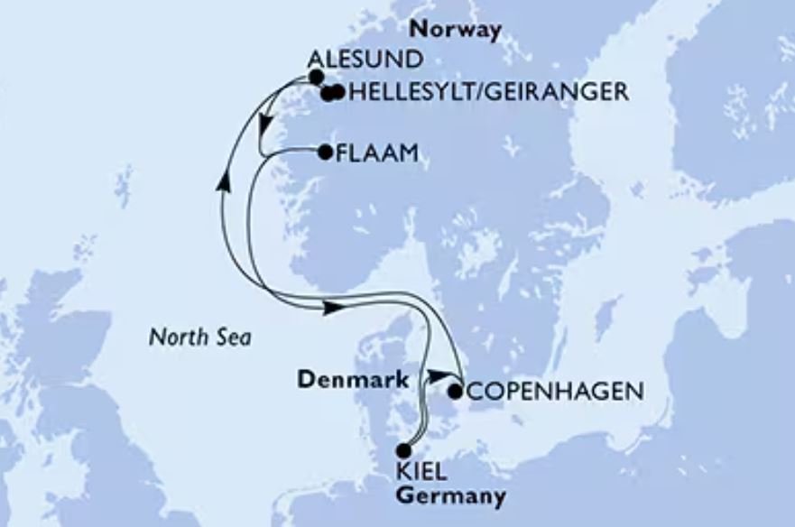 Kiel, Alemania · Copenhague, Dinamarca · Hellesylt, Noruega · Geiranger, Noruega · Alesund, Noruega · Flam, Noruega · Kiel, Alemania para volar de regreso a España. Es un Crucero a bordo del MSC EURIBIA, con un completo programa de animación diurno y espectáculos cada noche que harán de nuestro una experiencia completa.