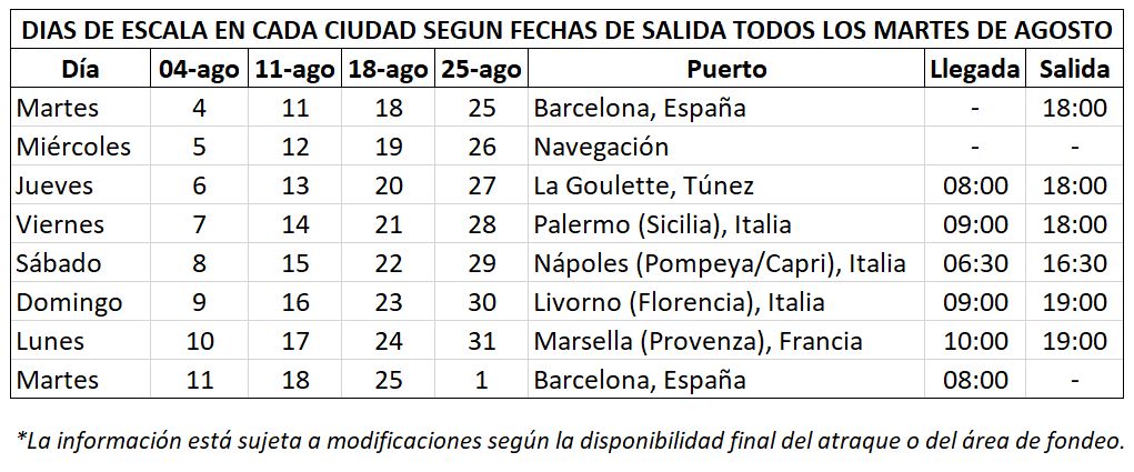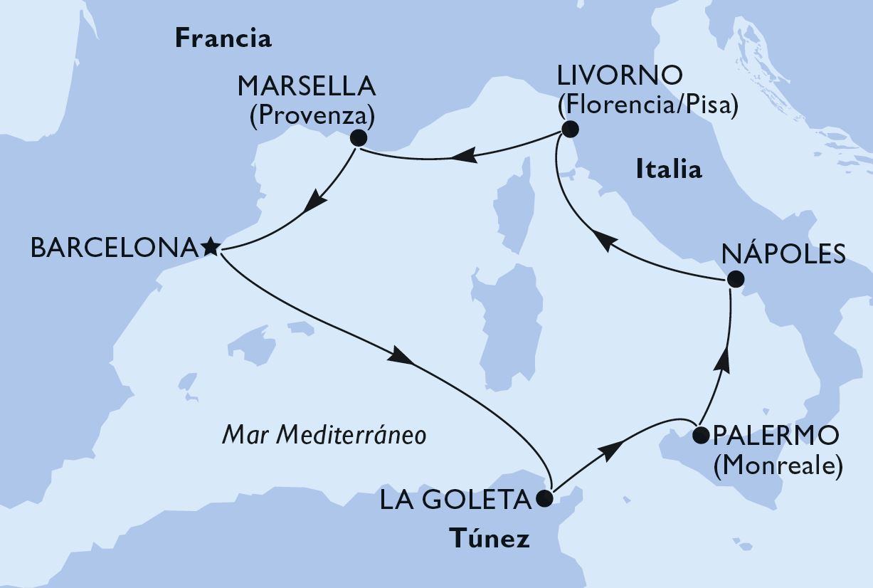 Salida desde el puerto de Barcelona visitando La Goulette (Túnez) , Palermo (Sicilia) , Nápoles (Italia), Livorono (Florencia - Italia) , Marsella (Francia) y desembarque en el puerto de Barcelona