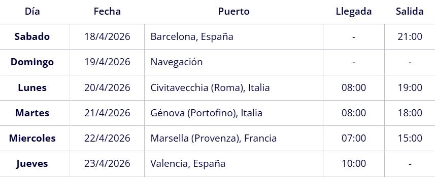 Salida de BARCELONA, España, con escalas de visita en las ciudades de Ibiza, Cagliari (Cerdeña), Civitavecchia (Roma). Génova (Portofino), Cannes (Costa Azul), y volviendo al puerto de embarque de Barcelona (España).