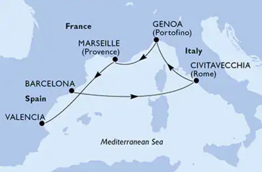 Os proponemos un estupendo Crucero con salida de BARCELONA y con escalas en Civitavecchia (Roma), Italia, Génova (Portofino), Italia, Marsella (Provenca) Francia y desembarcando en el puerto de VALENCIA .