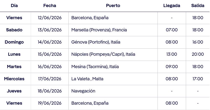 Os proponemos un estupendo Crucero con salida de BARCELONA (España) con escalas de visita en las ciudades de Marsella (Francia), Génova (Italia), Civitavechia (Roma, Italia) Mesina (Taormina, Italia), La Valeta (Malta) y volviendo al puerto de embarque de Barcelona (España).