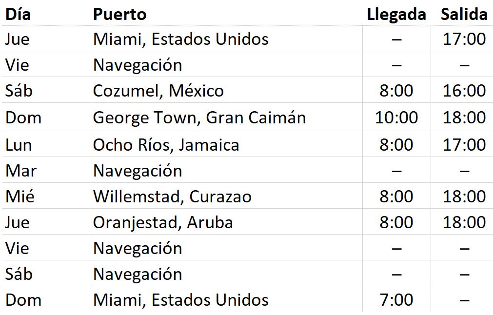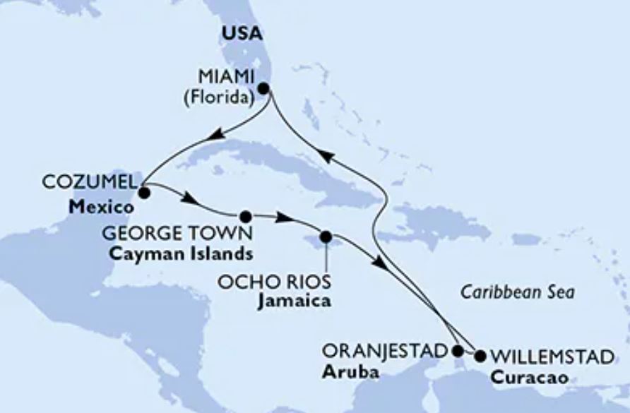Crucero de 10 noches con escalas en los puertos de: Miami (Estados Unidos), Cozumel (México), George Town (Gran Caimán), Ocho Rios (Jamaica), Willemstad (Curazao), Oranjestad (Aruba), Miami (Estados Unidos). a bordo del MSC DIVINA con un completo programa de animación diurno y nocturno con fiestas todas las noches en la discoteca del Barco.