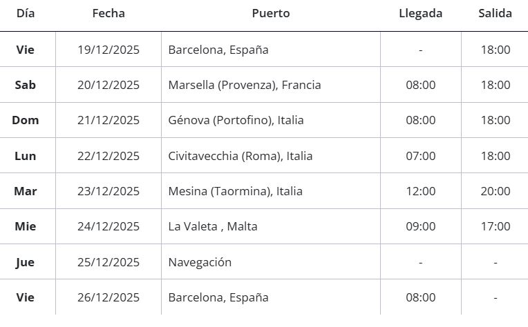Salida el Viernes desde el puerto de Barcelona, visitando Marsella (Francia), Génova (Italia), Civitavecchia (Roma), Mesina (Taormina Sicilia), La Valeta (Malta) y desembarque en el puerto de Barcelona el viernes siguiente
