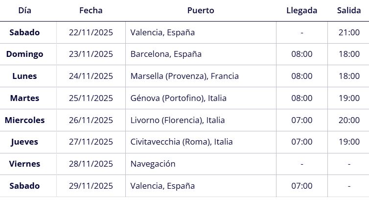 Os proponemos un estupendo crucero de 8 días y 7 noches salida desde Valencia, visitando Barcelona (Cataluña - España) Marsella (Provenza Francia) Genova (Portofino - Italia), Livorno (Florencia - Italia), , Civitavecchia (Roma) y desembarcando de nuevo en el puerto de Valencia, a bordo del MSC ORCHESTRA y con un completo programa de animación diurno y espectáculos y fiestas cada noche.