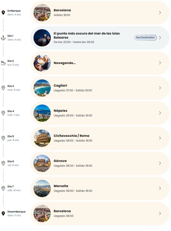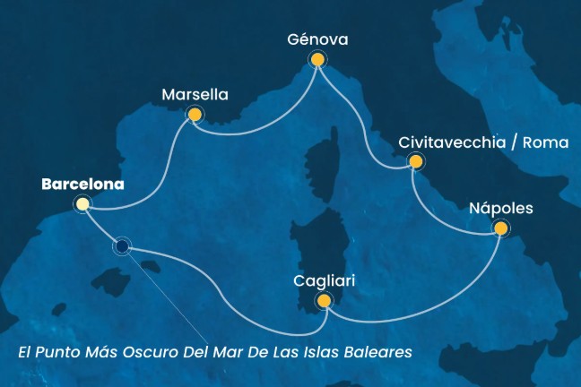Itinerario: Salida desde el puerto de Barcelona, visitando Cagliari (Cerdeña), Nápoles (Italia), Civitavecchia (Roma, Italia), Génova (Italia), Marsella (Francia) y desembarque en el puerto de Barcelona.