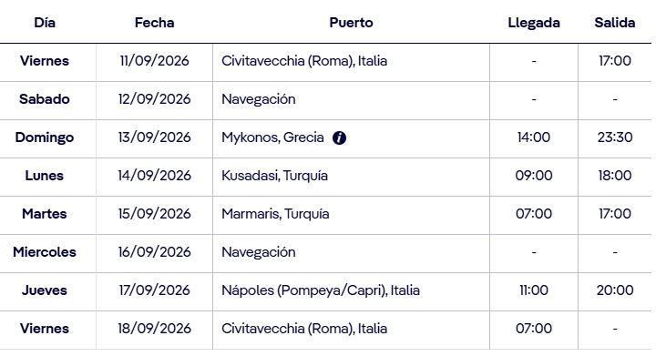 Salida desde el puerto de Chivitavechia Roma (Italia), visitando Mykonos (Grecia) Kusadasi, (Turquía) , Marmaris, (Turquía), Nápoles (Pompeya/Capri), Italia y regresando al puerto de Chivitacechia Roma (Italia), para regresar en avión desde Roma a España (Madrid o Barcelona) según vuelo elegido)