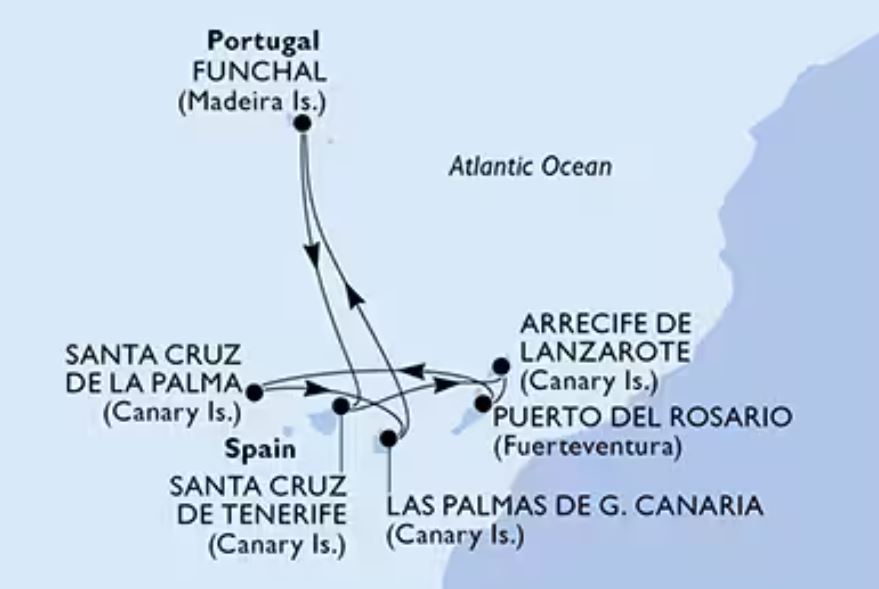 Salida desde Madrid (consultar vuelos desde otras ciudades) en vuelo directo para embarcar en Santa Cruz de Tenerife (España) y crucero con escalas en Las Palmas de Gran Canaria (España) Puerto del Rosario / Fuerteventura (España) Funchal Madeira (Portugal) Santa Cruz de la Palma (España) Lanzarote (España) y desembarcando de nuevo en Santa Cruz de Tenerife (España) para regresar desde allí en avión hasta Madrid o Barcelona. Es un Crucero a bordo del MSC MUSICA, con un completo programa de animación diurno y espectáculos en el teatro y fiestas cada noche en la discoteca del barco.