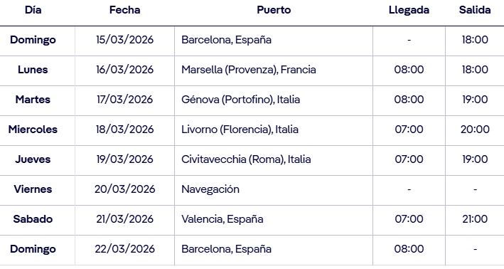 crucero de 8 días y 7 noches salida desde Barcelona, visitando Valencia (España), Marsella (Provenza Francesa) Genova (Portofino) Italia, Livorno (Florencia) Italia Civitavecchia (Roma) Italia y desembarcando de nuevo en el puerto de Barcelona, a bordo del MSC ORCHESTRA y con un completo programa de animación diurno y espectáculos y fiestas cada noche en la Discoteca del barco.