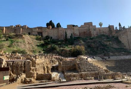 Con nuestras zapatillas más cómodas estamos listos para subir a nuestro autocar que nos recogerá a las 11Hras en el alojamiento, para desplazarnos hasta el centro de Málaga. Llegamos a la ciudad y se nota en el ambiente, destaca la cantidad de terrazas y restaurantes de los que poder desfrutar. Comenzamos nuestro paseo recorriendo el casco histórico, comenzando en la famosa Calle Larios, seguimos hasta la Plaza de la Constitución ( parada técnica para unas cervezas) y continuamos hacia la Catedral, el Teatro Romano y la animada Calle Alcazabilla, una de las más transitadas de la ciudad, ya que posee gran interés cultural y una animada vida social. Siguiendo nuestro recorrido, llegamos a la Alcazaba y Gibralfaro, una de las visitas imprescindible de nuestra ruta. La Alcazaba de Málaga es un palacio fortificado que fue construido por los musulmanes en el Siglo XI en el espacio ocupado con anterioridad por una fortificación fenicia. Se sitúa en el cerro de la ladera del monte de Gibralfaro.